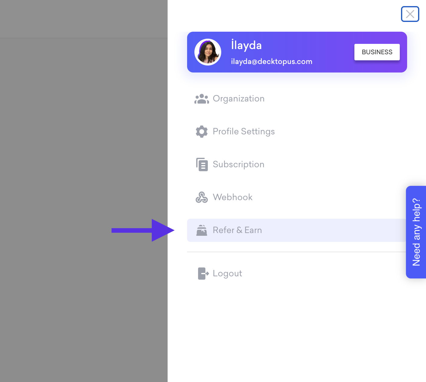 Decktopus' Refer & Earn feature enables users to earn rewards by referring new users to the platform. It works on a simple principle: existing users can invite their friends, colleagues, or followers, and when these referrals sign up for Decktopus using invitation, both the referrer and the new user receive rewards. Let's see how to utilize the Refer & Earn Feature:
