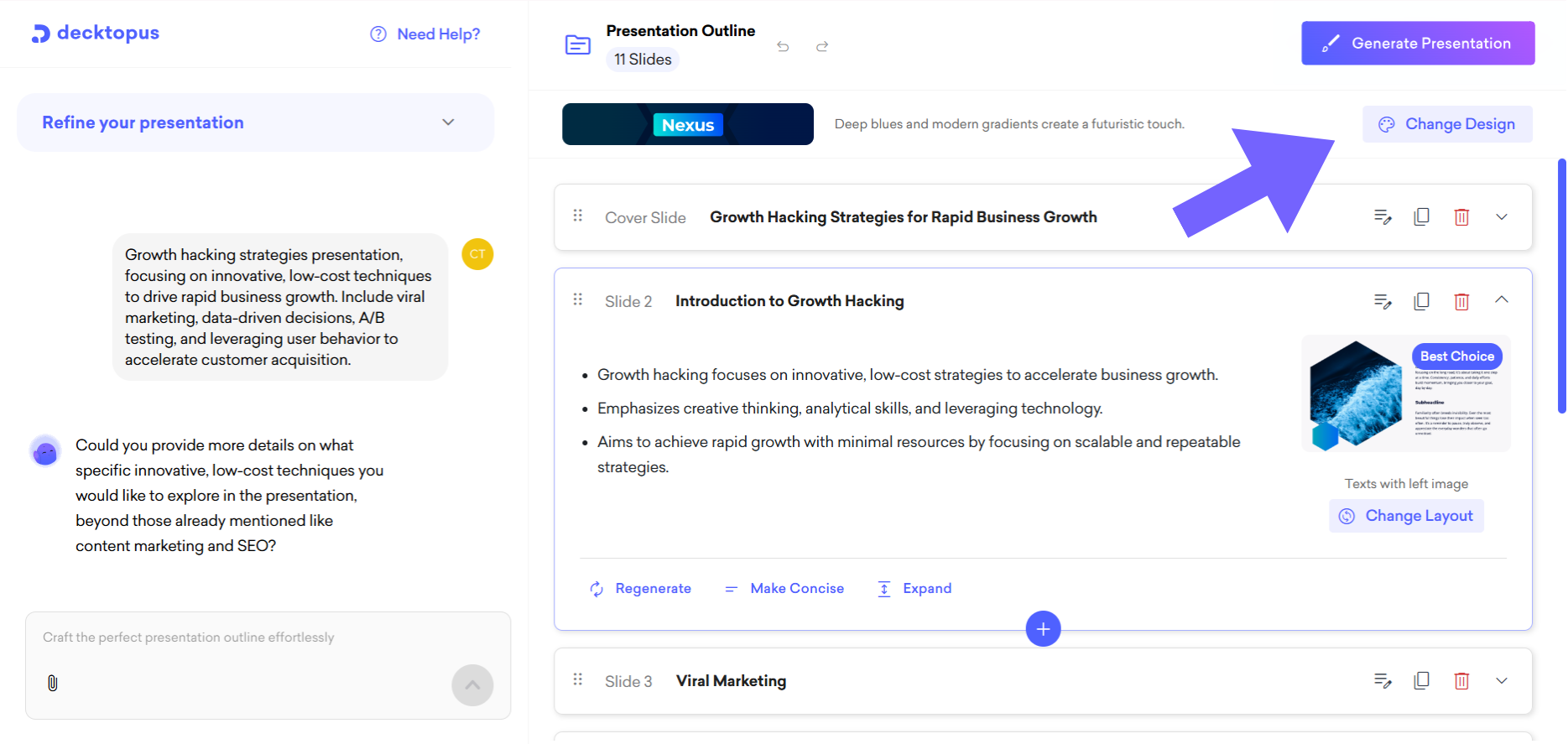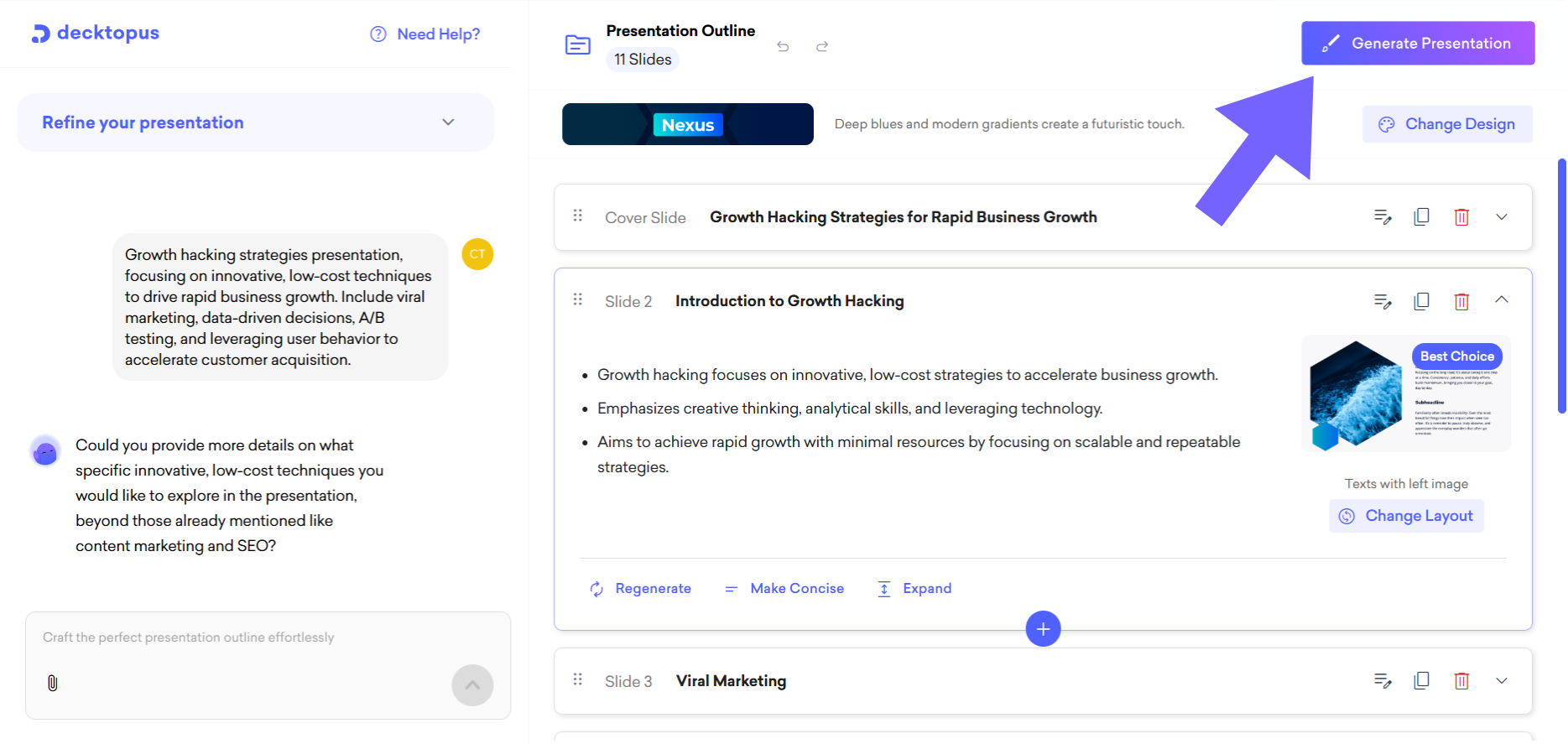 Click on “Generate Presentation” when you’re done with editing the outline and let Deckto do the heavy lifting!