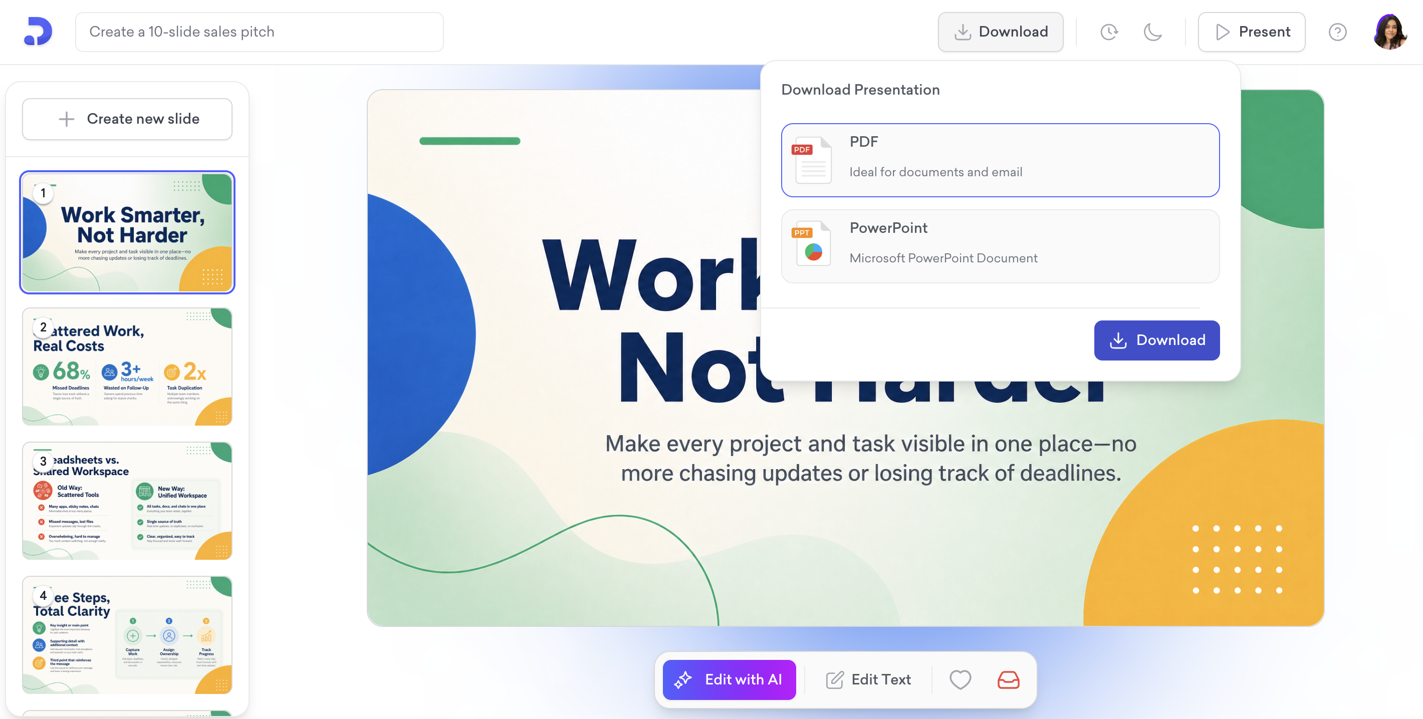 From there, you can export your presentation in both PDF and PPT format. Once you choose the format, simply click on the "Download" button to save it to your device.
