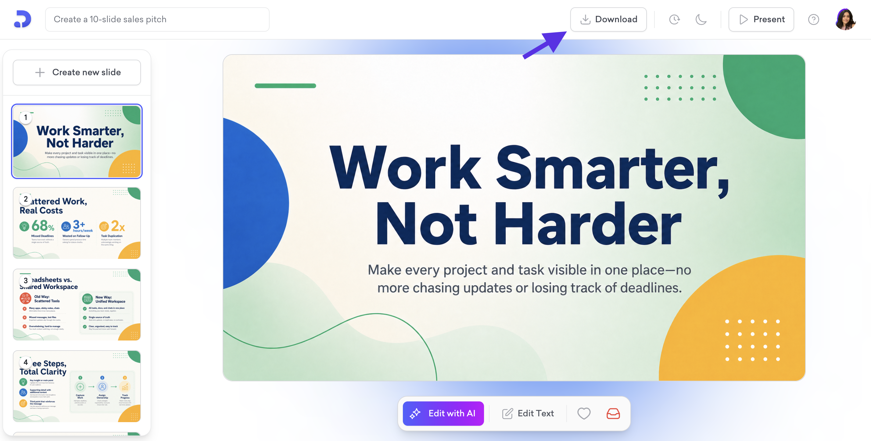 Choose the presentation you want to export and go to the editing page. Click on the "Download" button.